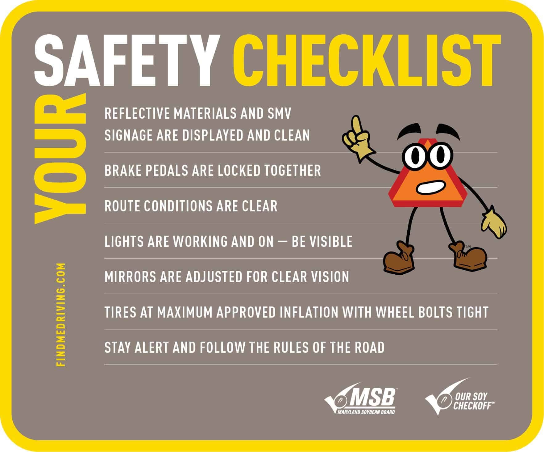 “Before we hit the road, we do a pre-check to make sure all our lights are working and slow moving vehicle emblems are clean,” commented Craig Biese, checkoff farmer-leader from Virginia. “Being proactive with safety measures is the first step in coming home safely at night.”